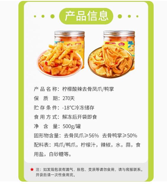 商品名称:精武无骨鸡爪柠檬酸辣罐装泡椒脱骨去骨凤爪500G鸭掌200G零食小吃休闲食品
